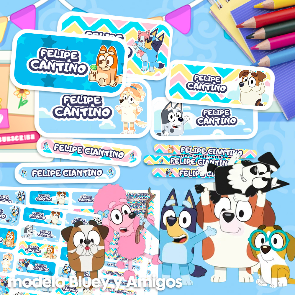 Jugá y aprendé con la familia Heeler con estas etiquetas de Bluey, la serie australiana que conquista corazones con historias sobre juegos, familia y la infancia vista con ternura y humor inteligente. Ideales para identificar cuadernos, libros, loncheras, mochilas y cartucheras, personalizadas con tu nombre en un diseño colorido que celebra a Bluey, Bingo, Bandit y Chilli en sus aventuras cotidianas.Perfectas para los más pequeños del jardín y primaria, pero también para padres que aman la serie tanto como sus hijos, son una elección ideal para iniciar el año escolar con imaginación, juego y las lecciones más valiosas sobre la vida familiar.